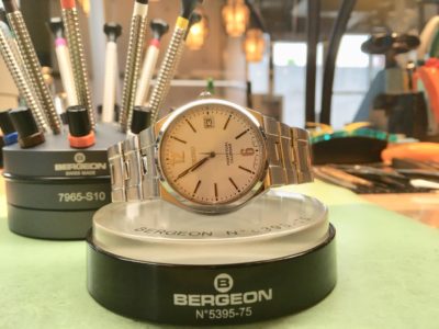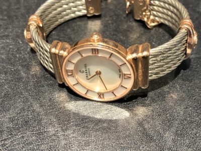 お客様からご依頼いただきましたお時計は、シャリオールの時計です。 独特のワイヤーの様なベルトと上品な時計のデザインが特徴です。 お客様の1番お気に入りのお時計だそうです。