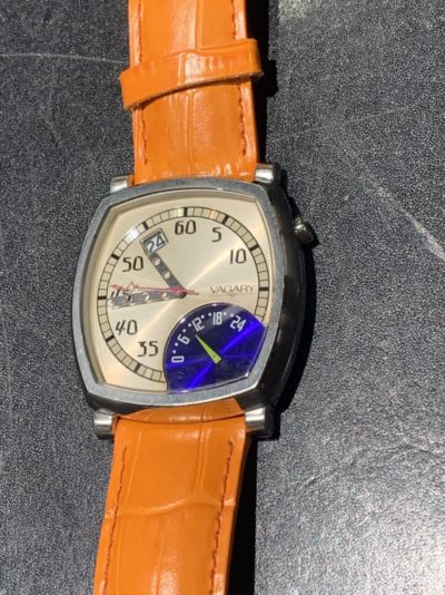 今回、お持込み頂きました時計は「VAGARY」のデザインウォッチです。 お客様が、デザインが気に入って買った大事なお時計です。 文字盤の綺麗な青と、ベルトのオレンジが良いコントラストになっております。