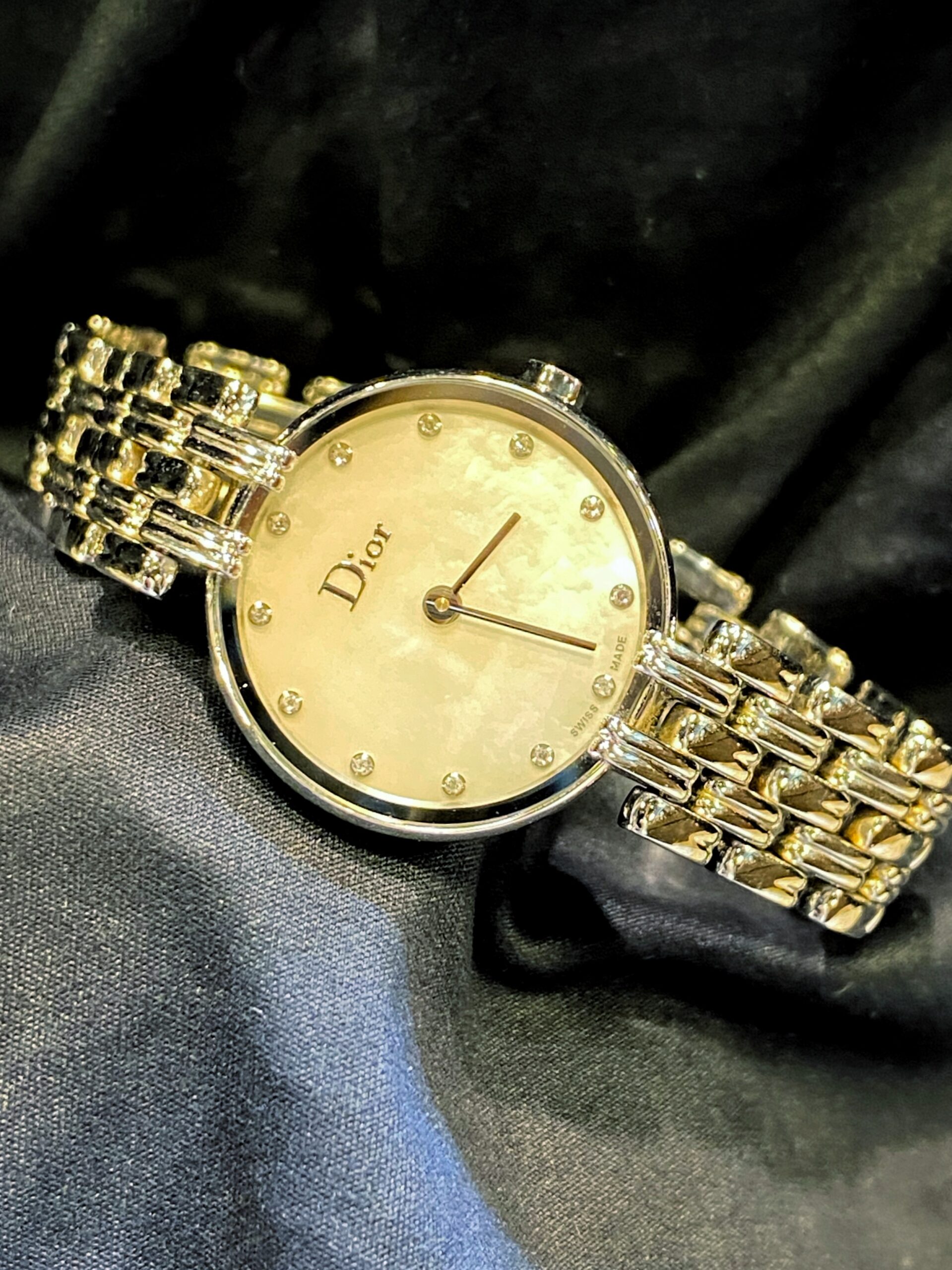 ディオールの素敵なお時計をお持ち込み下さいました。 インデックスには宝石があしらわれており、シンプルながらエレガントなお時計です。