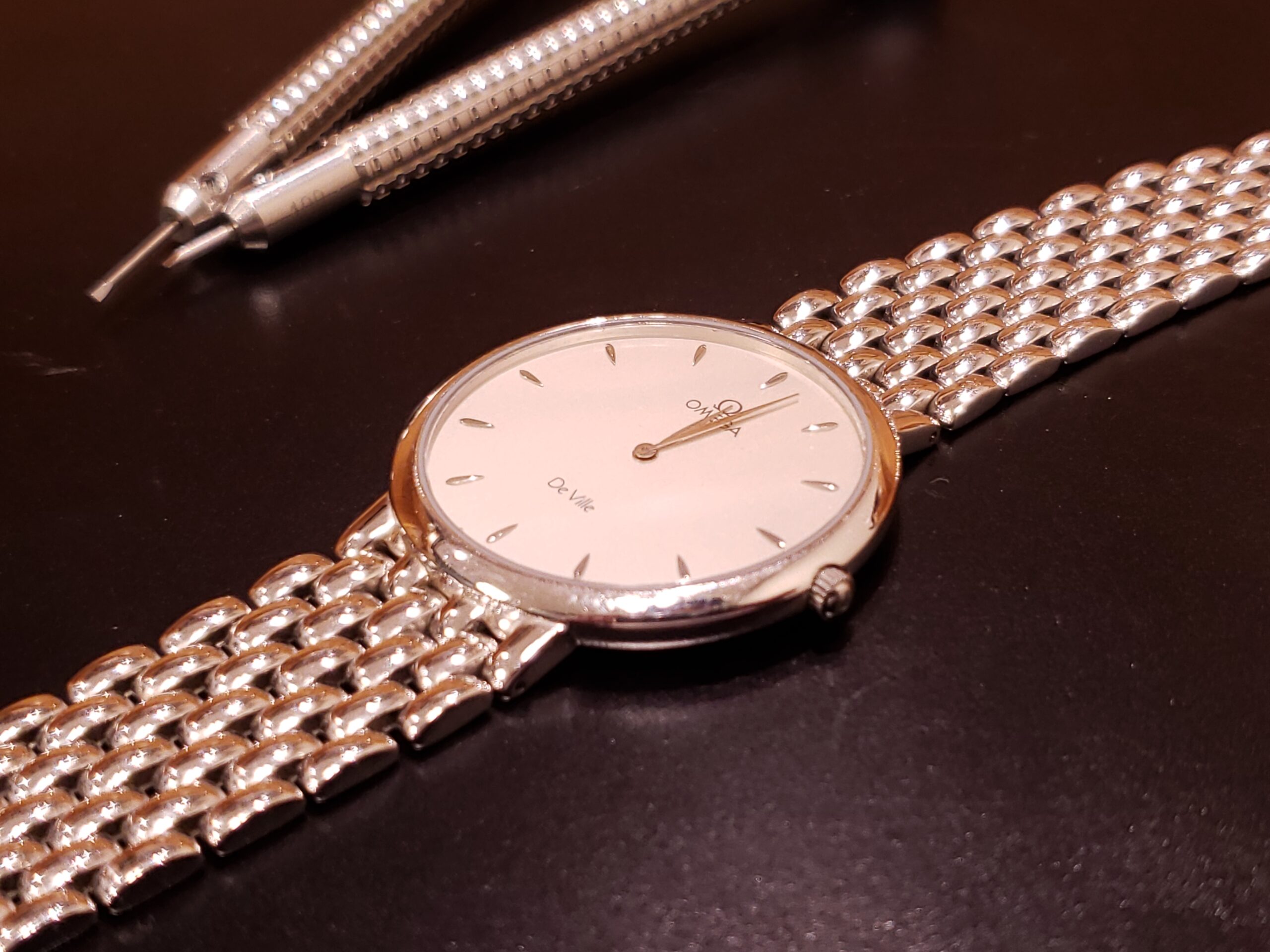 オメガ デ・ヴィルでございます。 オメガのドレスウォッチラインで、エレガントで洗練されたデザインが人気のモデルです。
