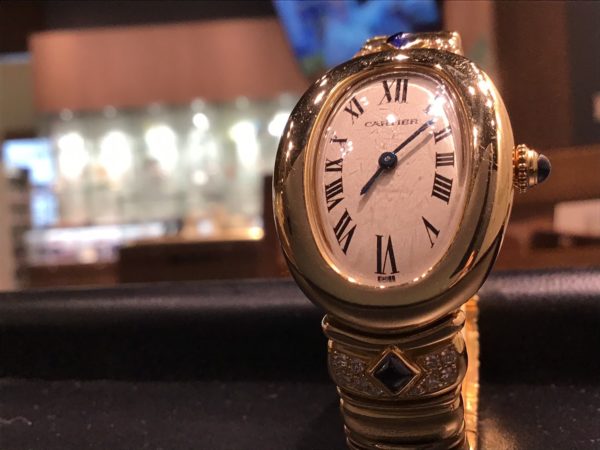 この度お預かりしました時計はカルティエでございます。 ケースもベルトも金色に輝き、さらにはベルトに光り輝く綺麗な石が埋め込まれております。 とてもゴージャスなお品物です。