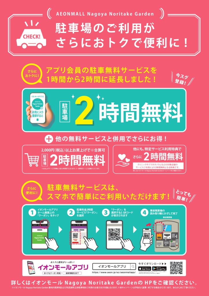 さて、当店「なごや時計宝石修理研究所」がございますイオンモール Nagoya Noritake Gardenでは、イオンモールアプリの会員様に、アプリのクーポンをご利用頂ければ駐車料金2時間無料サービスを実施しております。