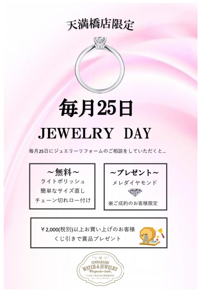 毎月25日にジュエリーのリフォームのご相談をしていただくと、お得な特典が付いてきます! ①ライトポリッシュ無料 ②簡単なサイズ直し無料(地金を使用しないもの) ③チェーン切れロー付け無料