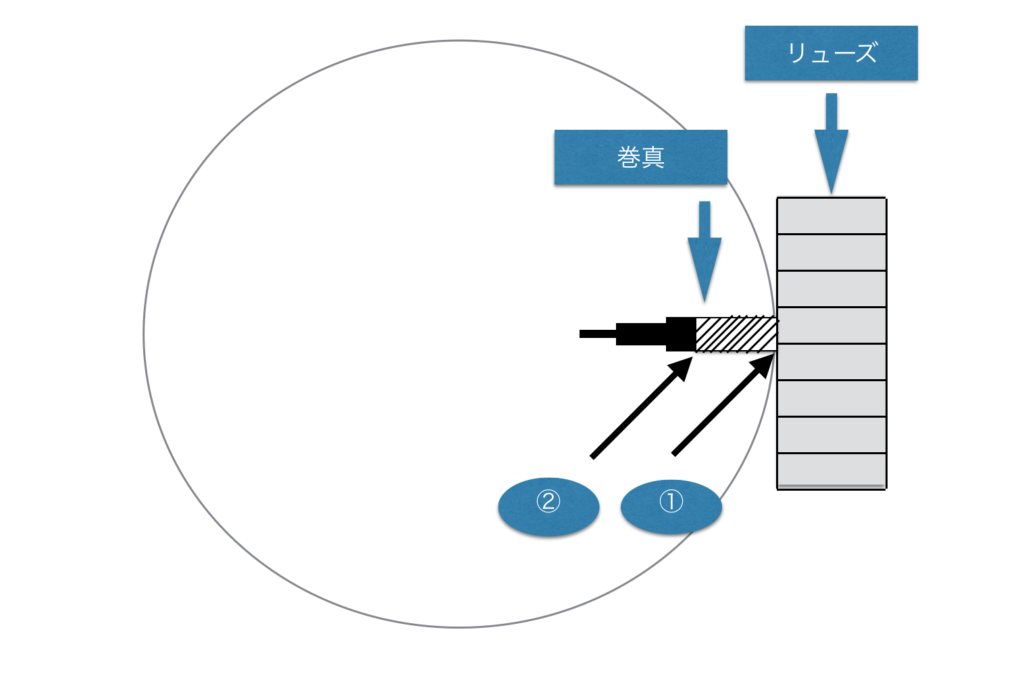 リューズが時計から見えている部分で、巻真が時計の内部に入り込んでいる部分になります。
