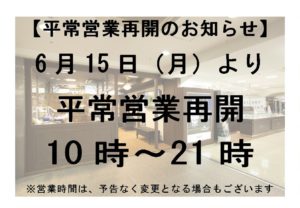 さて、6/15(月)より平常営業の“10:00~21:00”となりますことを、ご連絡申し上げます。