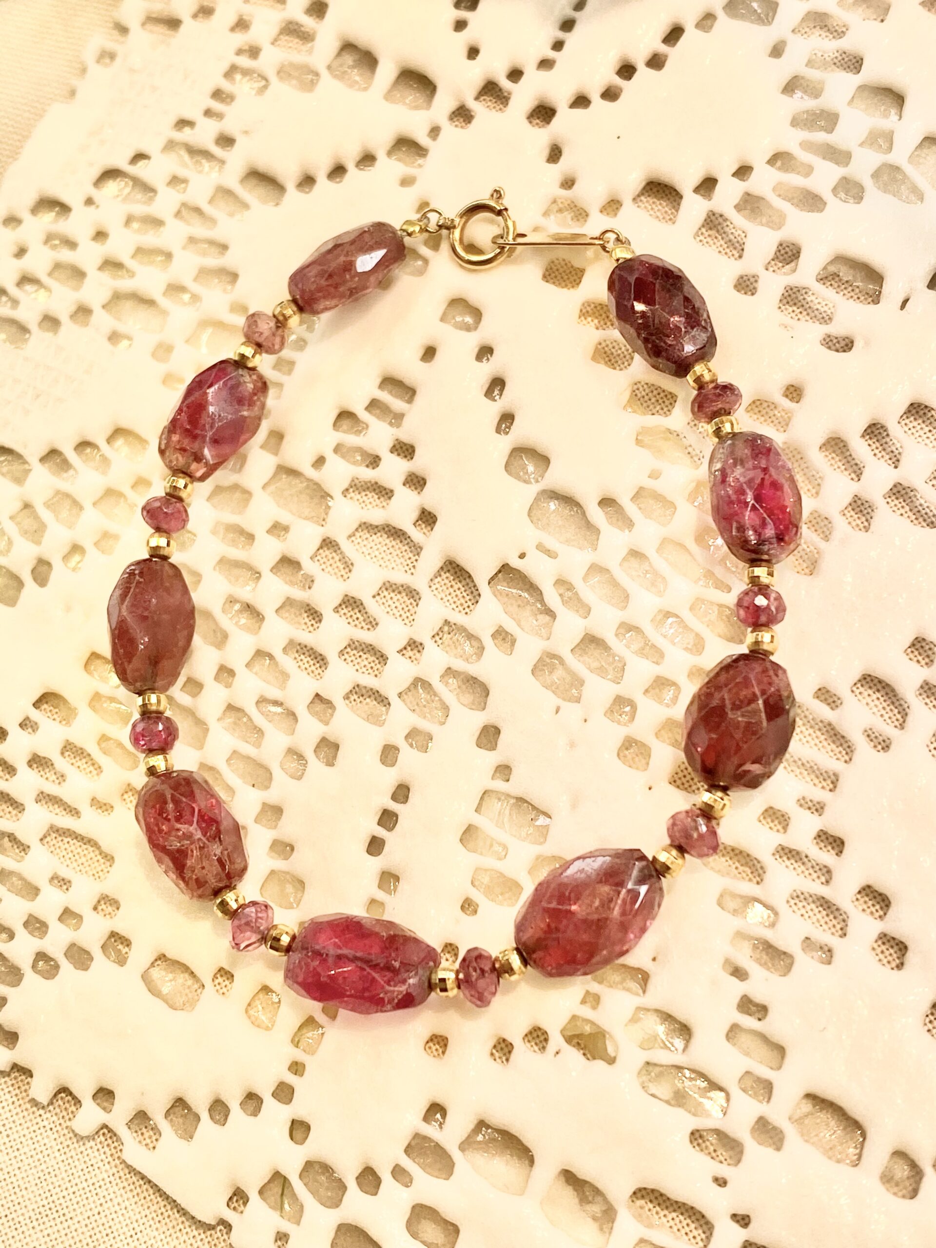 赤色の天然石と金色のビーズの組み合わせが素敵なブレスレットをお預かり致しました。