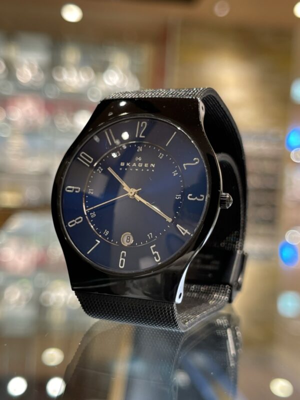 今回こちらのSKAGENのお時計をオーバーホール、ガラス交換致しました。