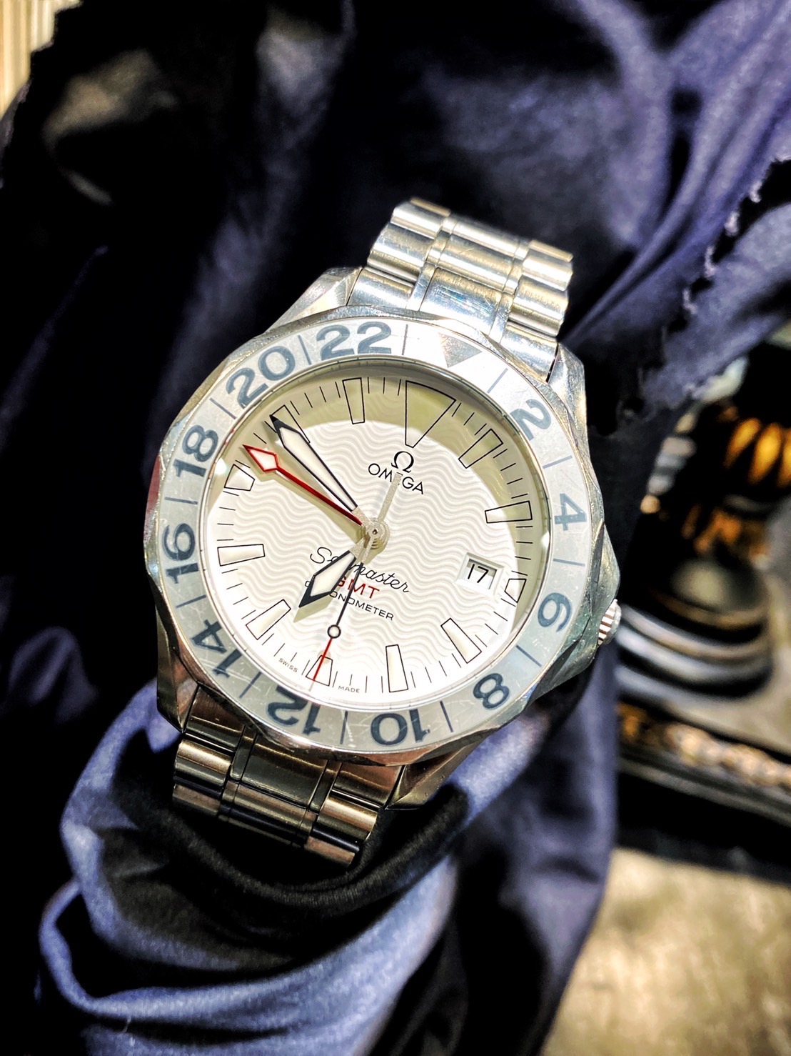 今回こちらのオメガのシーマスターGMTモデルの分解掃除をさせて頂きました。