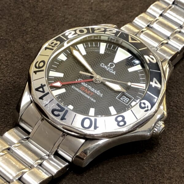 今回お預かりさせて頂きましたこちらの時計はOMEGA50周年記念モデルでベゼルのデザインが上下で色が反転していてとてもかっこいいデザインになっています。 お客様も20年近く使われているそうですが今回ベルトが壊れてしまったとのことでお持ち込み頂きました。今後もご愛用していただけるようにしっかり修理させて頂くためまずお見積もりさせて頂きます。
