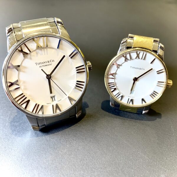 【ティファニー ペアウォッチ 修理】 今回は、素敵なペアウォッチを素敵なお二人からお預かり致しました。 ティファニーのお時計で、ベルトとお修理や洗浄をさせていただきました。 二つとも傷はありますがとても大切にされており、二人が大事に想い合っているのが伝わりますね。 ペアウォッチは、二人が同じ時間を過ごすという意味もあり、とても大切な想いのあるお時計ですので、丁寧に作業させていただきました。