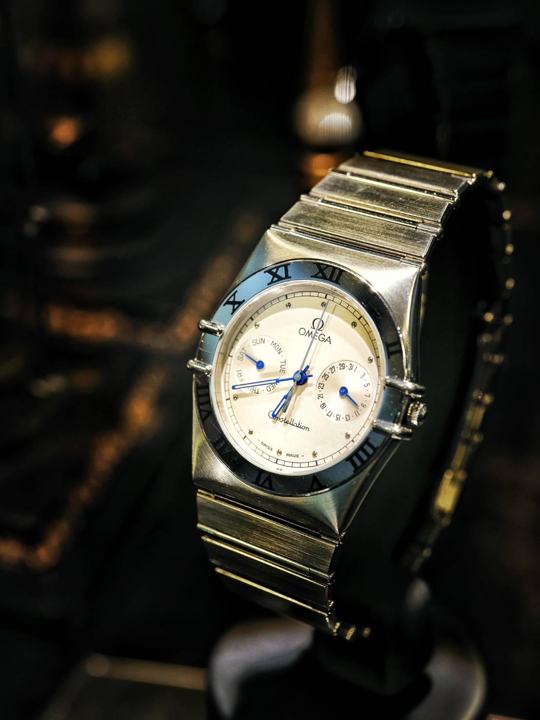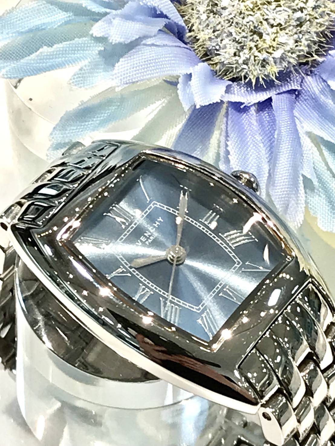 ベゼル部のローマンインデックスや3時9時位置の爪も特徴的なデザインで、ケースとベルトがフラットで一体化したスタイリッシュなお時計です。