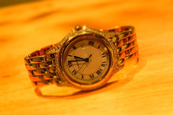 ベセル周りの透明石がゴージャスなカルティエの時計をお預かりしておりました。
