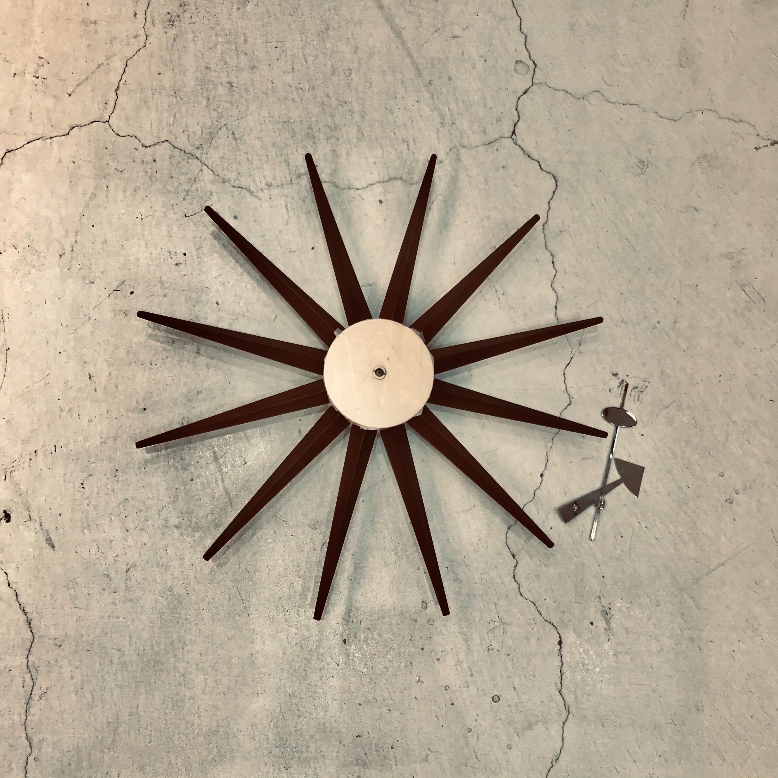 放射状に広がるデザインや、ダークブラウンにシルバーの針がとてもお洒落な掛け時計をお預かりいたしました! とてもお気に入りの時計ですが針が動かなくなってしまい、修理にお持ち込みいただきました。