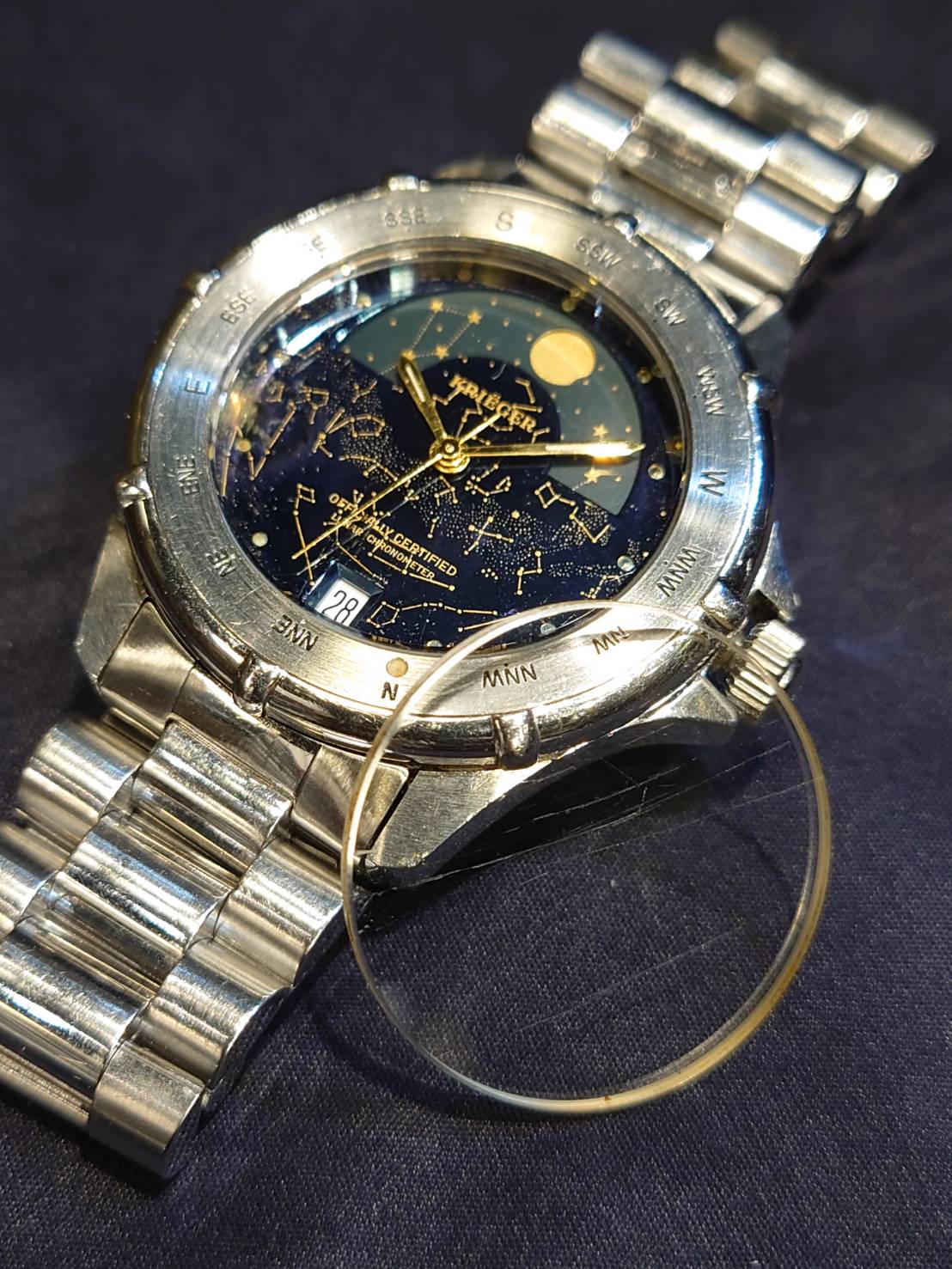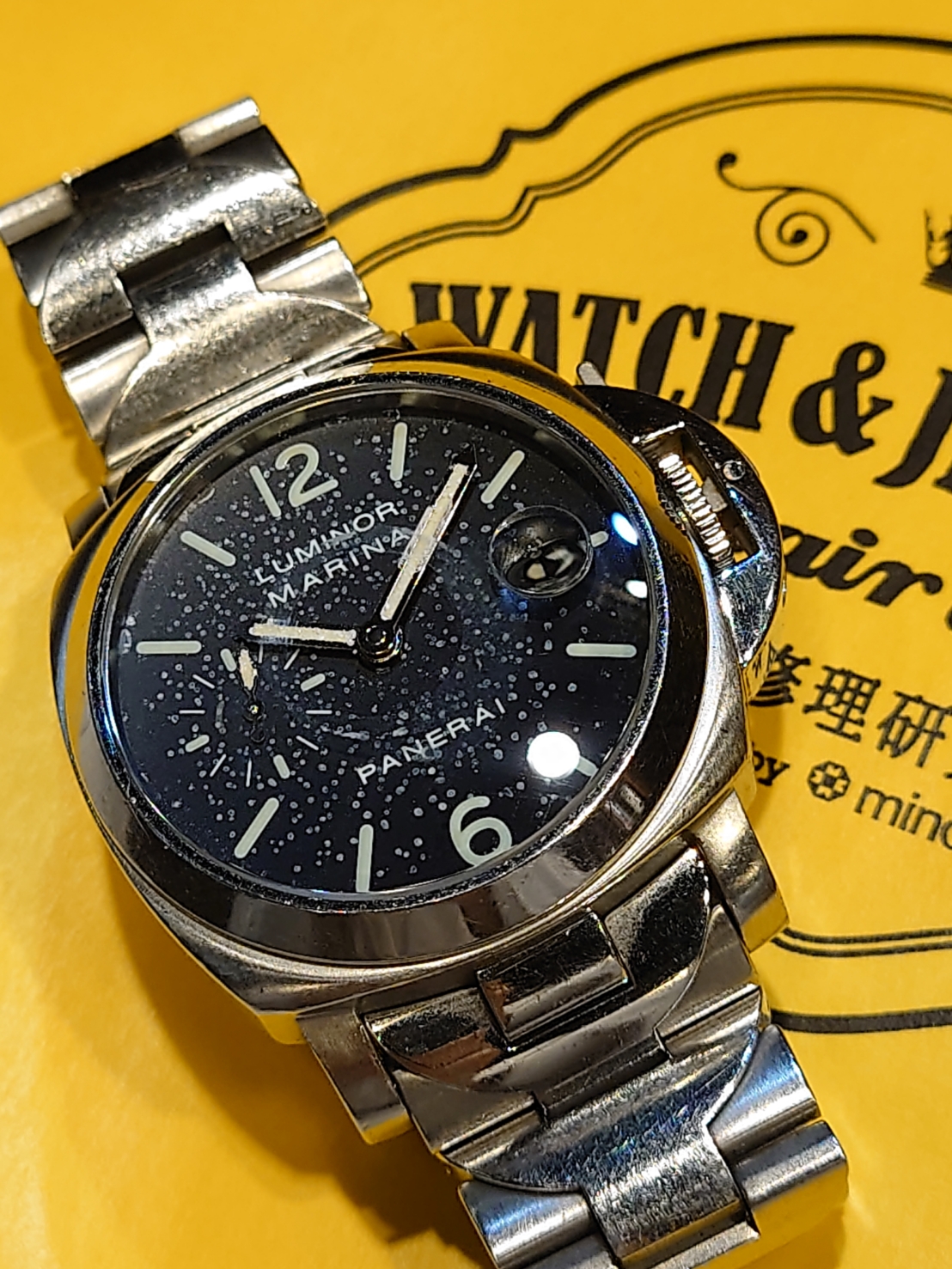 内部に湿気が侵入してしまい、文字板にかなりの傷みが見受けられます。
