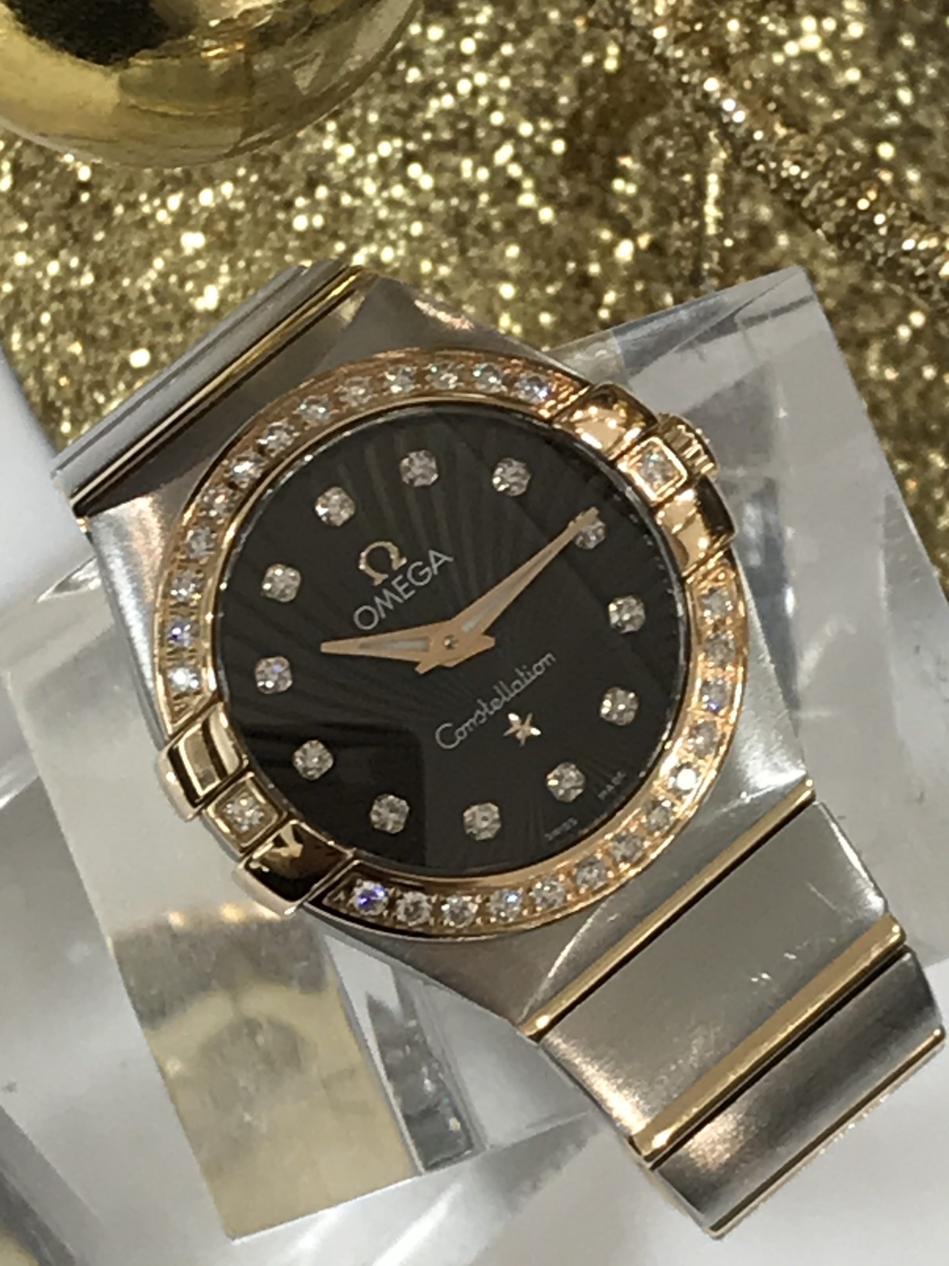 人気のオメガのコンステレーション、こちらの時計は、ベゼルと文字盤に、豪華なダイヤモンドが使われ、ラグジュアリーなデザインです。