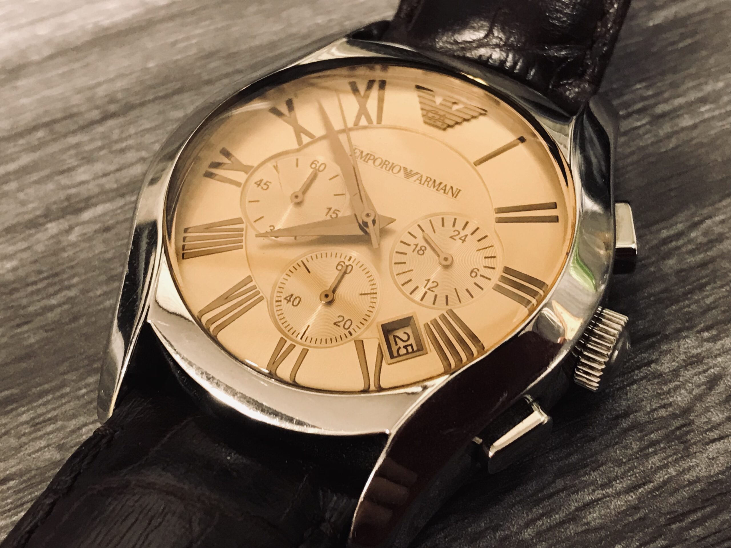 今回、アルマーニのクォーツ時計をお預かり致しました。