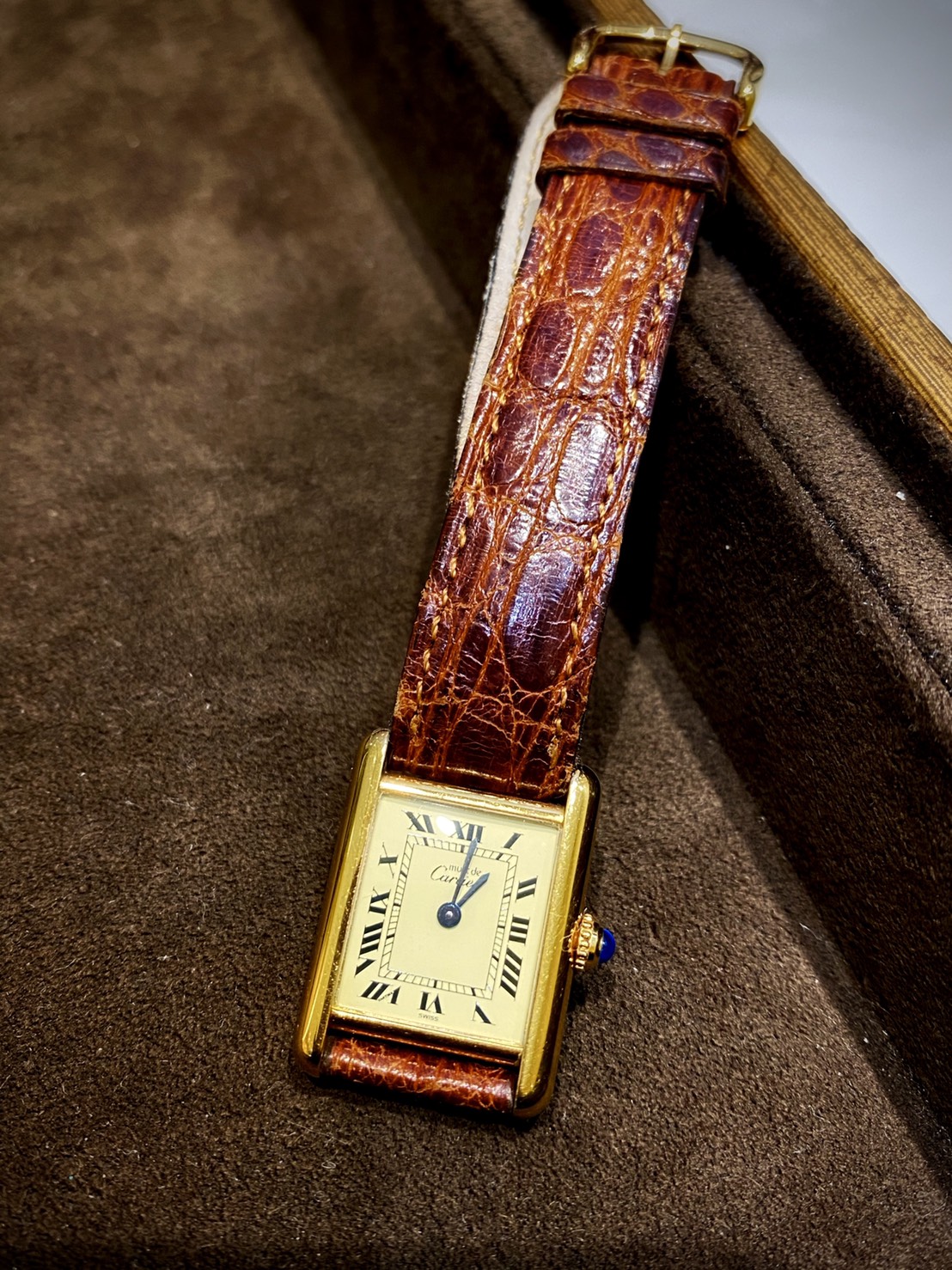 Cartier Tankの電池交換をお預かりしました。 ブラウン革ベルトの風合いが暖かみがあり、リュクス感の漂うとても素敵なお時計でございます。