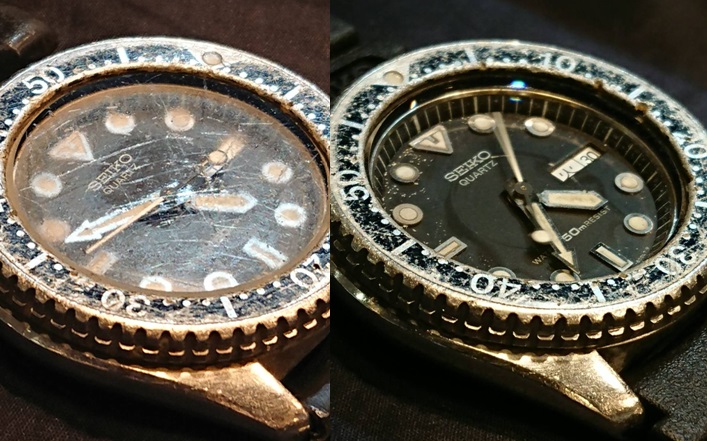 永年のご愛用から、ガラス面が無残なことに。文字板の劣化はともかく、時刻確認にも支障をきたす、とのことで、ガラス交換のご依頼を頂きました。