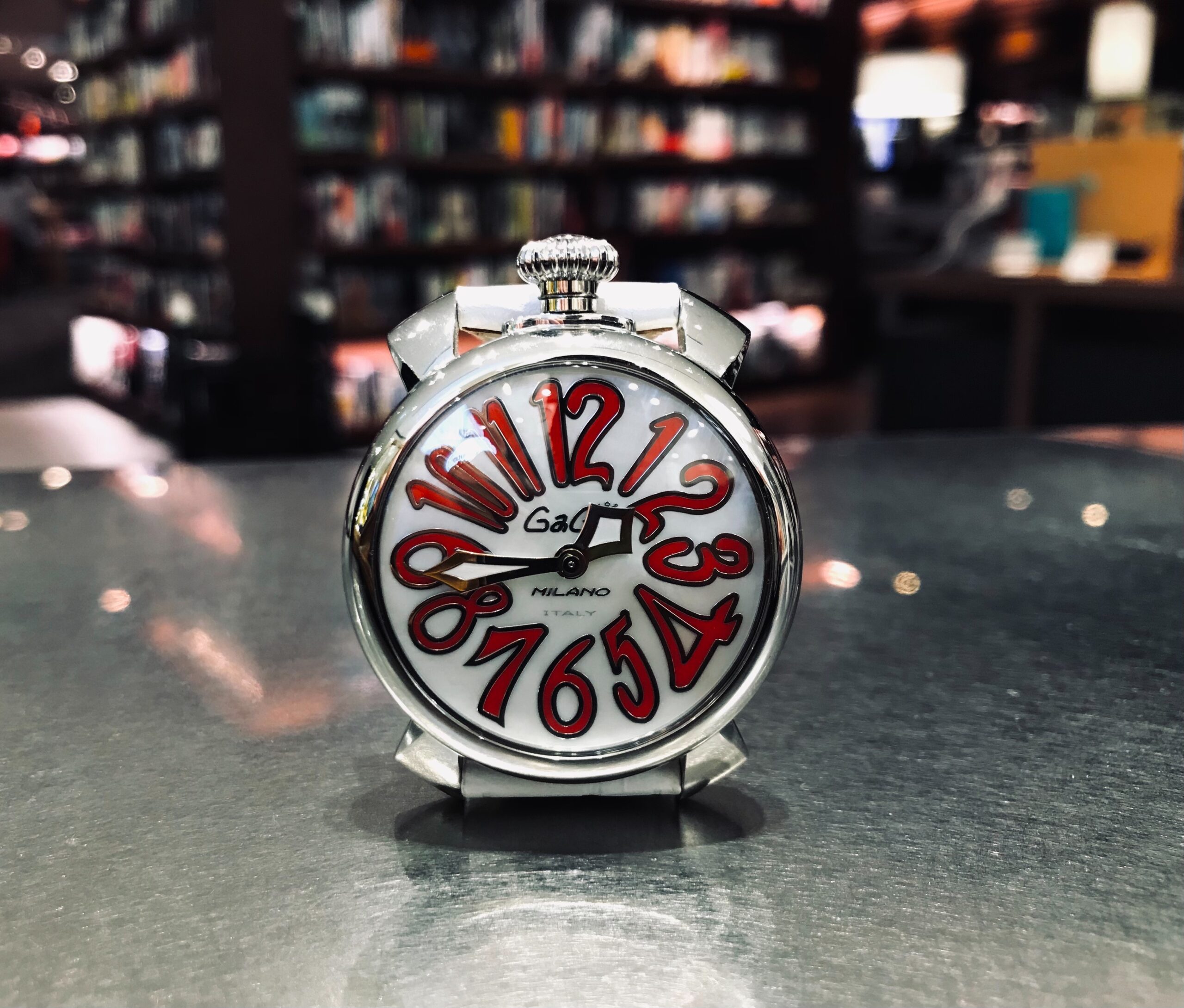 白い文字盤に赤いインデックスがとても映えるこちらのガガミラノ、時刻が止まってしまった為、電池交換でお持ち込みいただきました。