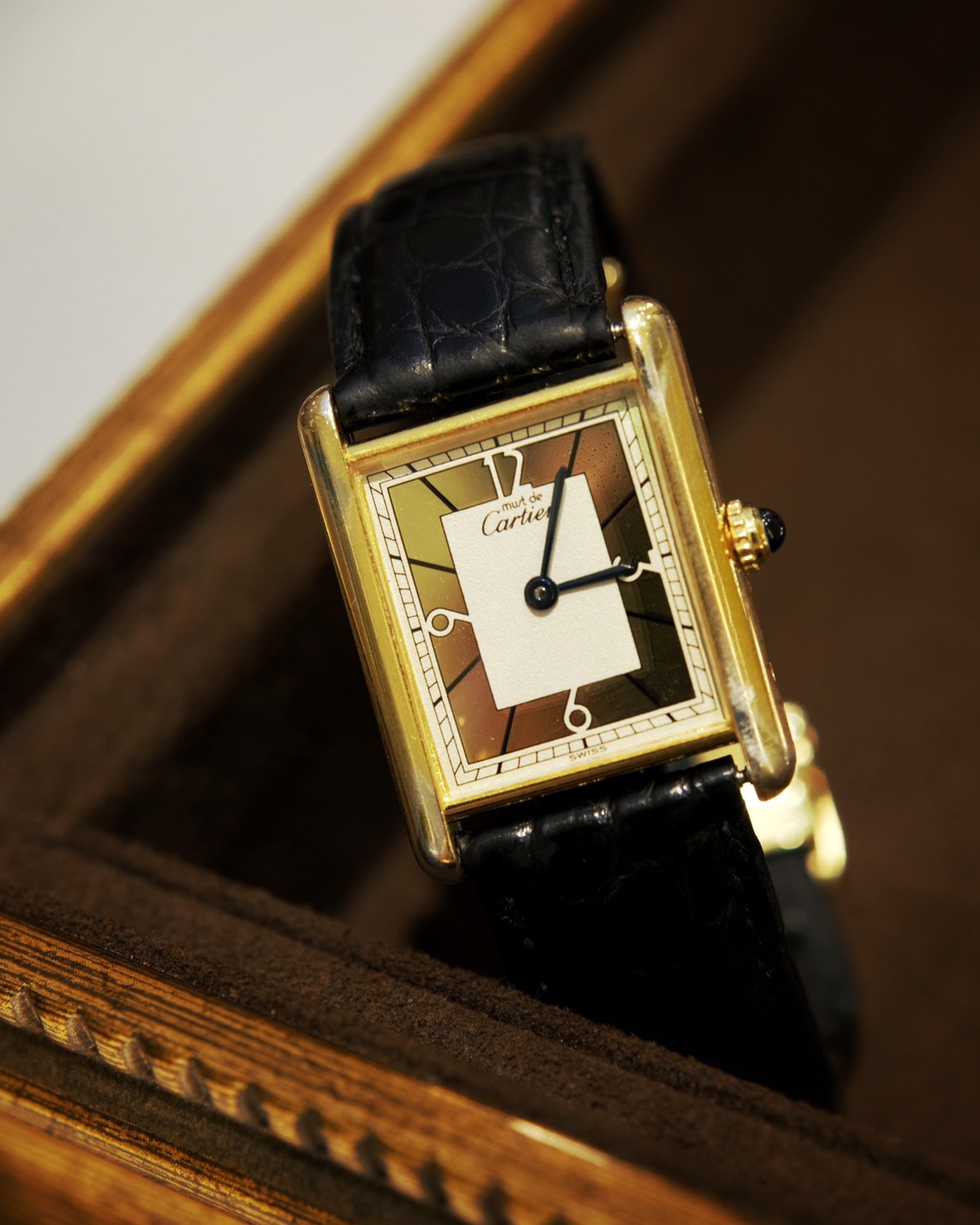 Cartier Tankのオーバーホール修理をさせていただきました。 ゴールドとホワイトで絶妙に配色されたデザインの文字盤からは、とてもクラシカルな雰囲気が漂う素敵なお時計でございます。