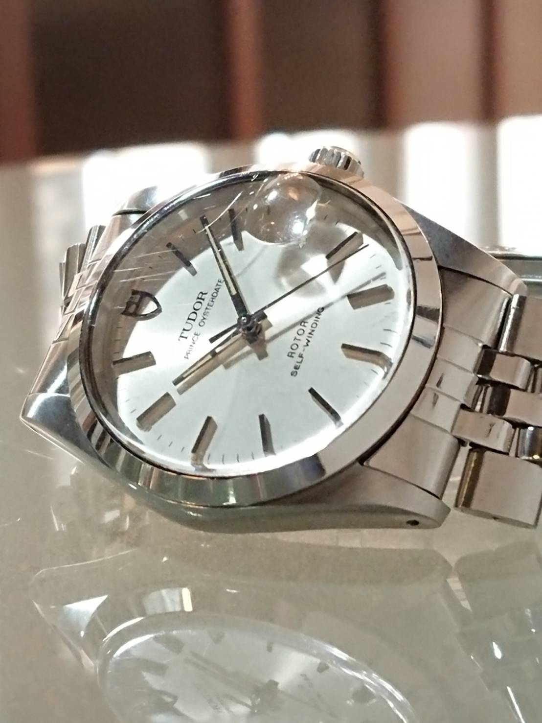 愛好家の方は皆様ご存知、ロレックスの姉妹ブランド“チューダー”です。 チューダーは、ブランドのロゴマークが大きく変遷したのも有名ですが、その変遷でいつの年代のものかも概ね掴むこともできますね。 チューダー・ローズが使用されていたのは1970年代以前なので、こちらのモデルはそれ以降、ということになりますね。 薔薇のシンボルも瀟洒ですが、盾のシンボルはまた精悍なイメージではないでしょうか。