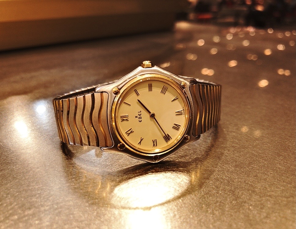 この度はゴールドとシルバーの配色が素敵なEBELの時計をお預かりいたしました。