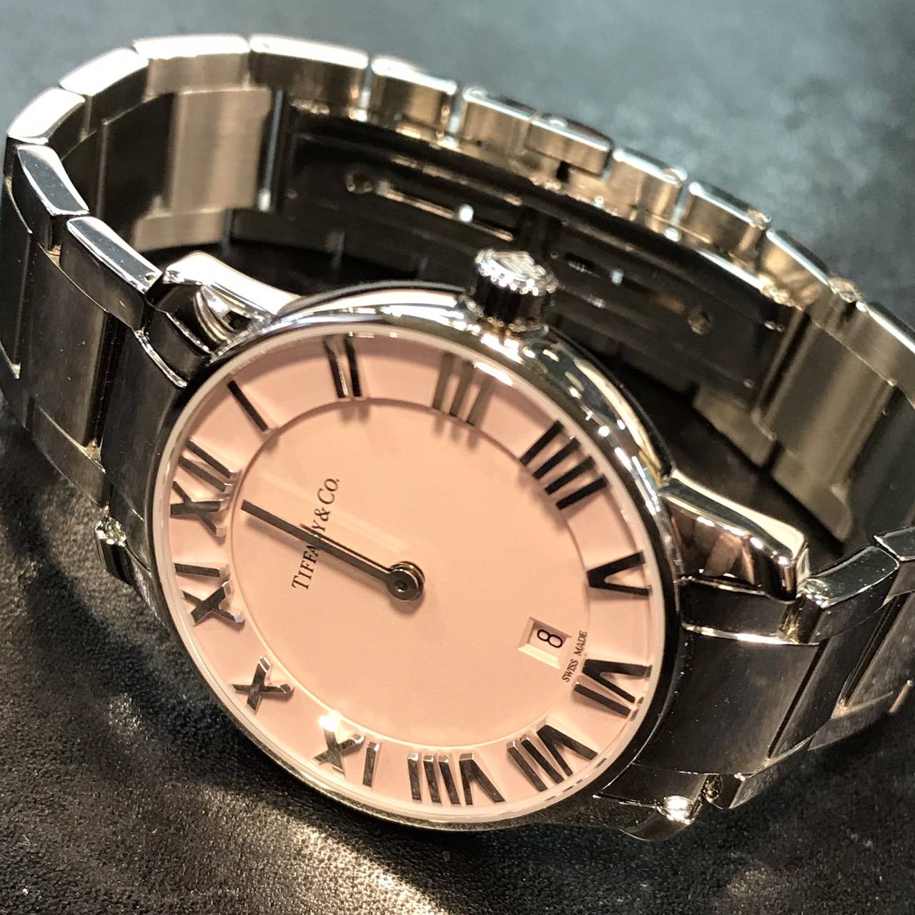 今回は、電池交換でお預かり致しました。 1837年、アメリカ・ニューヨークで創業された、ジュエリーブランドとして世界的に有名なティファニーの腕時計。