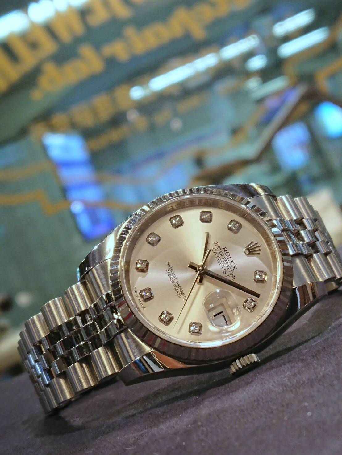 文字板にセッティングされた10ポイントのダイヤモンドが、お手許をさり気なく彩ります。5連ブレスレットなので、腕を傾けるごとに独特の輝きも楽しんでいただけます。 全体的にはシルバーカラーなのでシックに、かつ煌びやかに、悠久に流れる“時”に想いを馳せて頂けることでしょう。