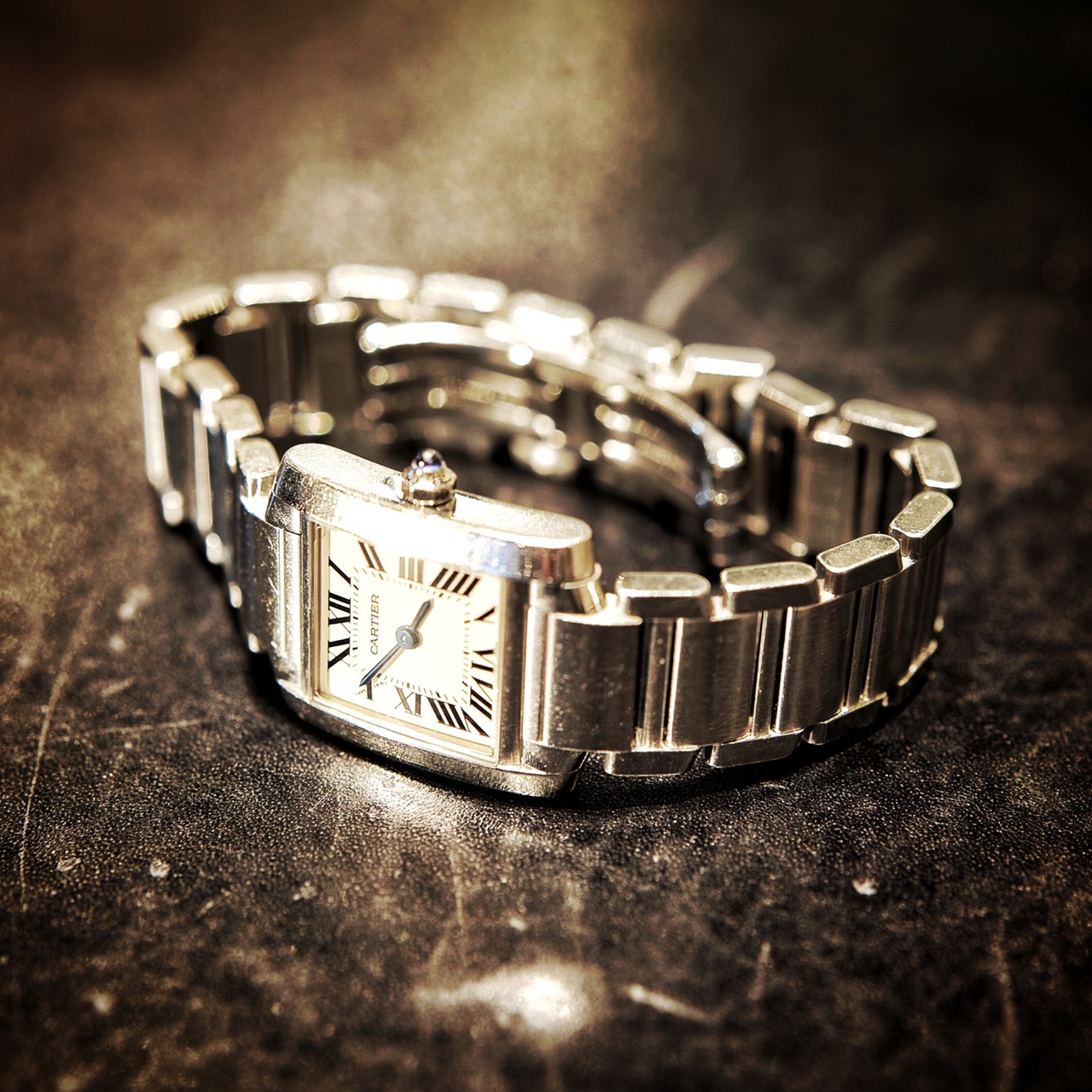 カルティエ タンク フランセーズのオーバーホールを行いました。 タンクフランセーズはケースとベルトの一体感が印象的な時計です。 腕に沿うように弧を描いおりケースサイドやブレスサイドにも高低差があり凝ったデザインとなっており、とても素敵な時計です。
