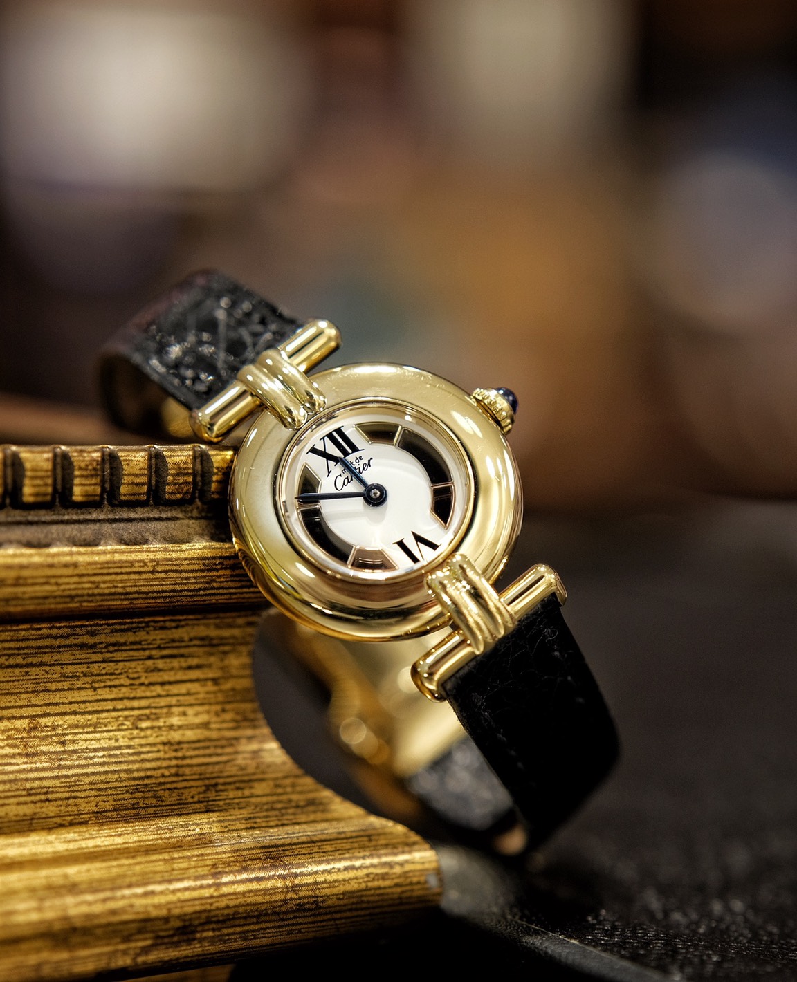 カルティエ マストコリゼ トリニティ ヴェルメイユのオーバーホールを承りました。 ローマンインデックスにブルースティール針、ブルーカボションリューズに加え、トリニティーカラー(ピンクゴールド、イエローゴールド、ホワイトゴールド)を配置したダイヤルがお洒落なお時計ですね!