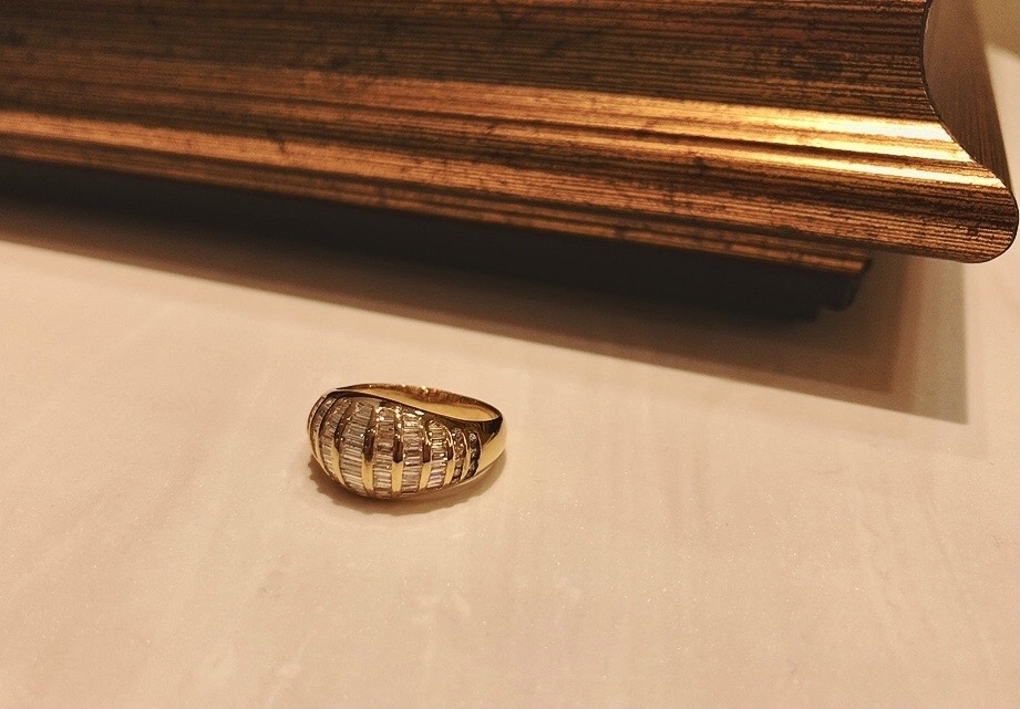 横方向に幾つも細い石が嵌められていることにより、キラキラと繊細な光を放つこちらのリングは、サイズ直しのため当店にお持ち込みいただきました。