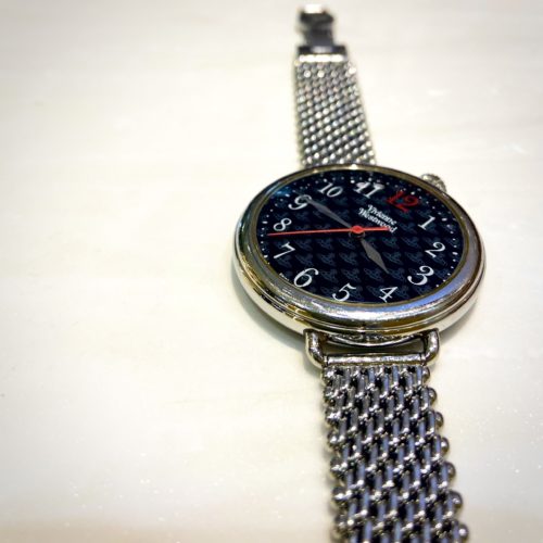 今回お預かり致しましたお時計は、型破りなスタイルで知られるイギリスのファッションブランド、 ヴィヴィアンウエストウッドのお時計です。素敵なデザインのお時計が多いブランドであり、 お客様ご愛用のこちらのお時計も、文字盤の傾きが変わっていてオシャレですね。