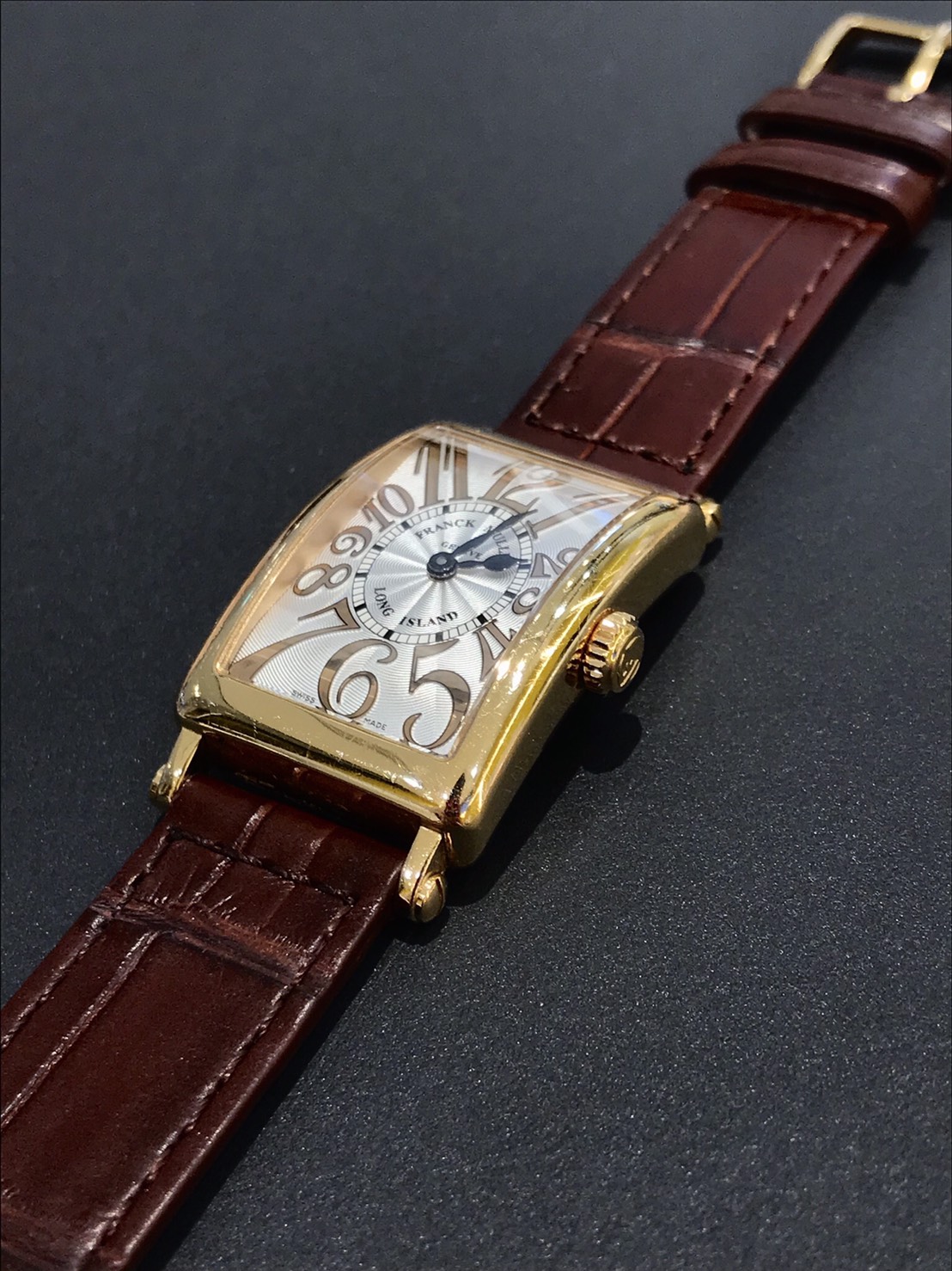 フランクミュラーのロングアイランドをお預かりしました。 長方形の文字盤と、楕円形の分目盛が特徴的で、 カーブのある文字盤により手首にフィットしやすい形の素敵な時計です。