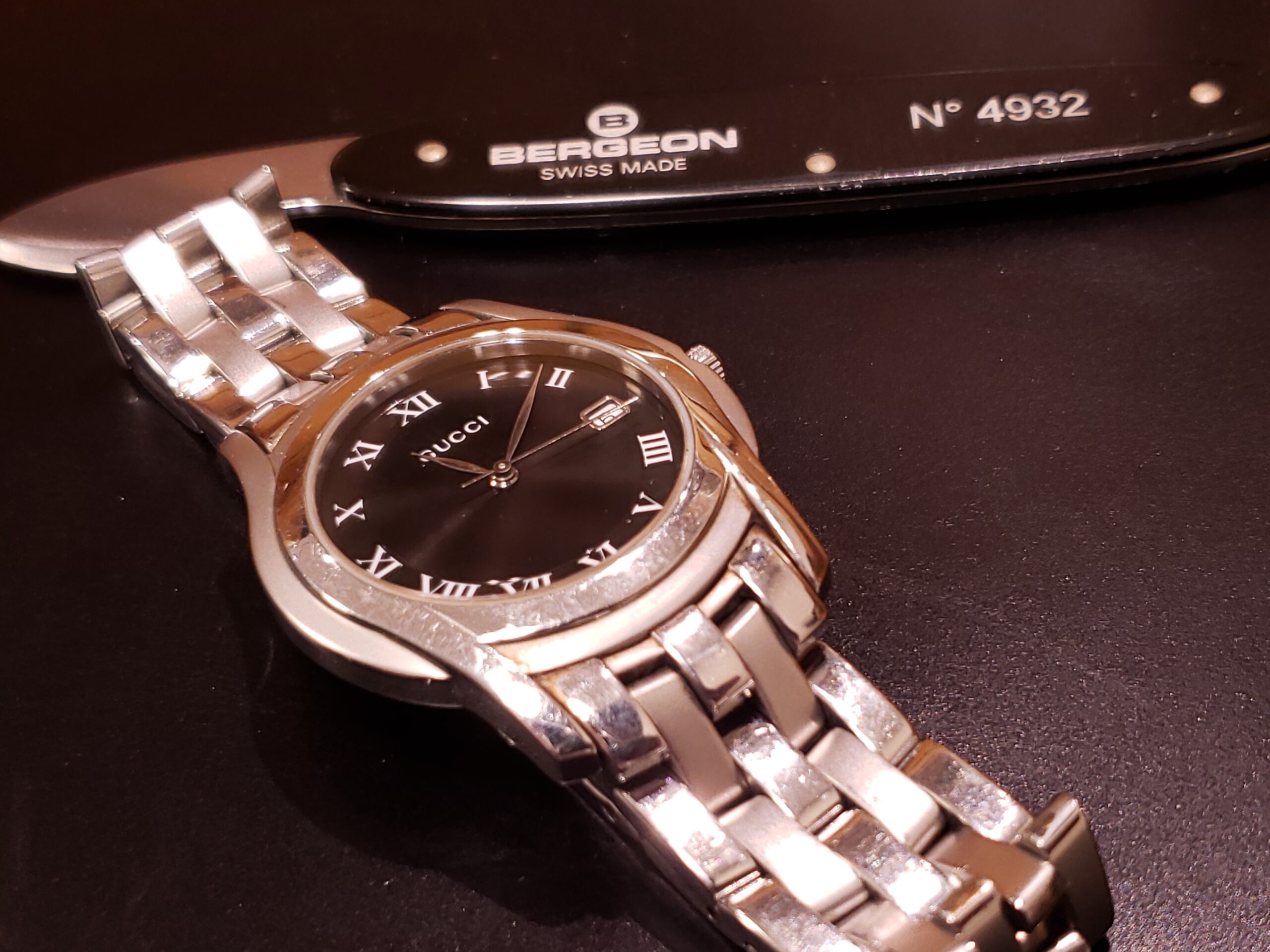 グッチでございます。 リューズの接着が経年劣化で外れ、時刻合わせの際に外れてしまうと、ご相談を頂きました。