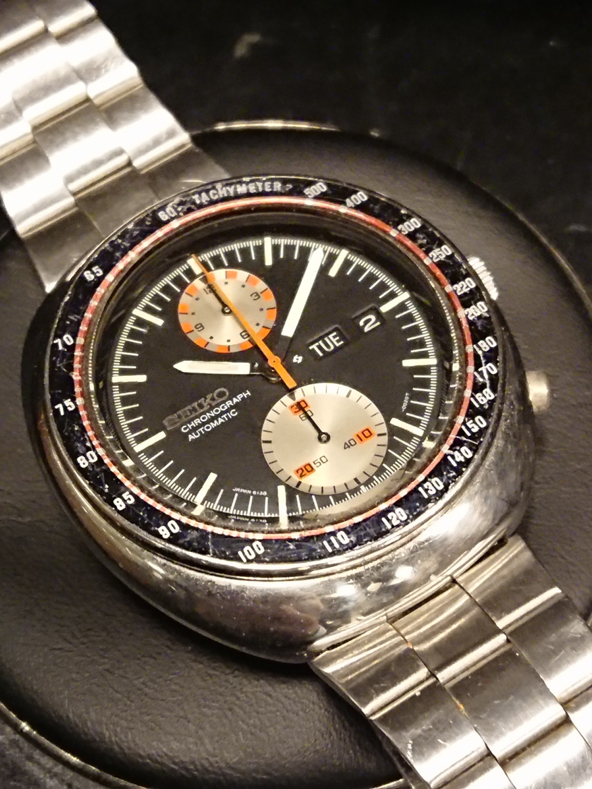 【セイコー・クロノグラフ オーバーホール】 1970年代頃に発売された、2つ目の自動巻クロノグラフ。 1970年代と言えば、セイコーがクォーツ・ウォッチを実用化させ、そちらにシフトして行くことになりますが、クォーツ・ウォッチとともに次世代へ向けて機械式の拡充を図るために海外向けに作られたモデルが多数存在します。 こちらは、そんな海外向けに作られたクロノグラフ・モデルですが、その中でも通称“UFO”とも呼ばれ、今も人気の高いモデルです。