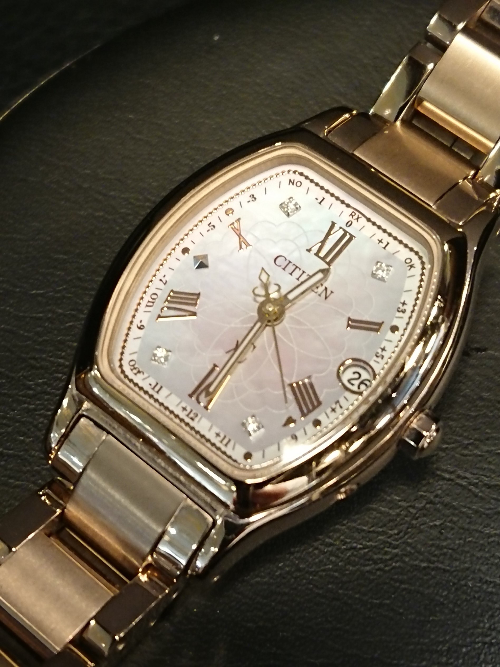 シチズン・クロスシー人気のカラー、サクラピンクの限定モデルです。 白蝶貝文字板にダイヤモンド4石を配した特別感溢れるデザインで、実にエレガントにお手許を彩ってくれます。ザザーオブパールを使用した文字板が、優しい輝きを放ちます。