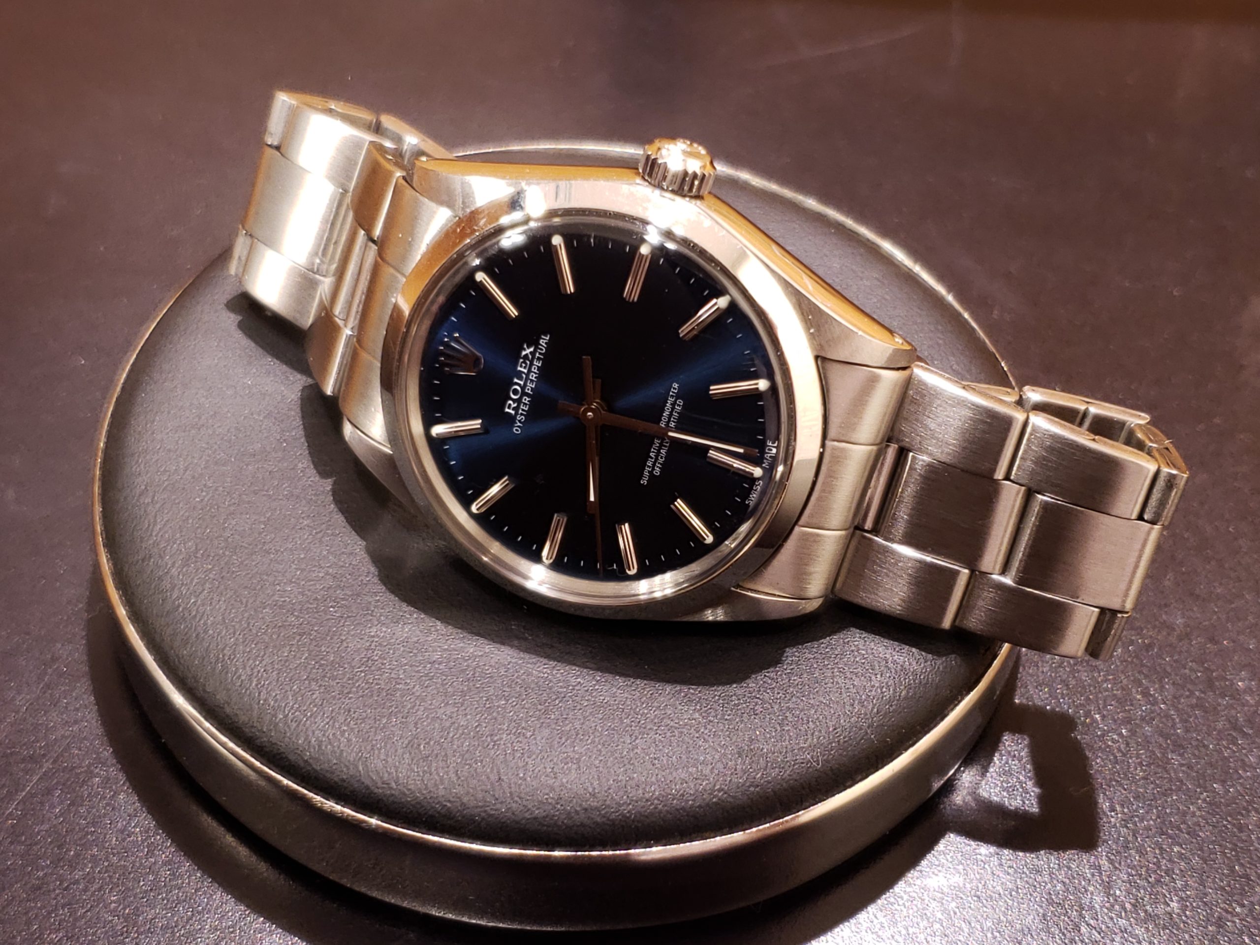 ロレックス オイスターパーペチュアルでございます。 こちらはコマがピンで繋がっているタイプのベルトではなく、板巻きのタイプです。 当店ではこのような普通はコマ外しできないものでも対処可能です!
