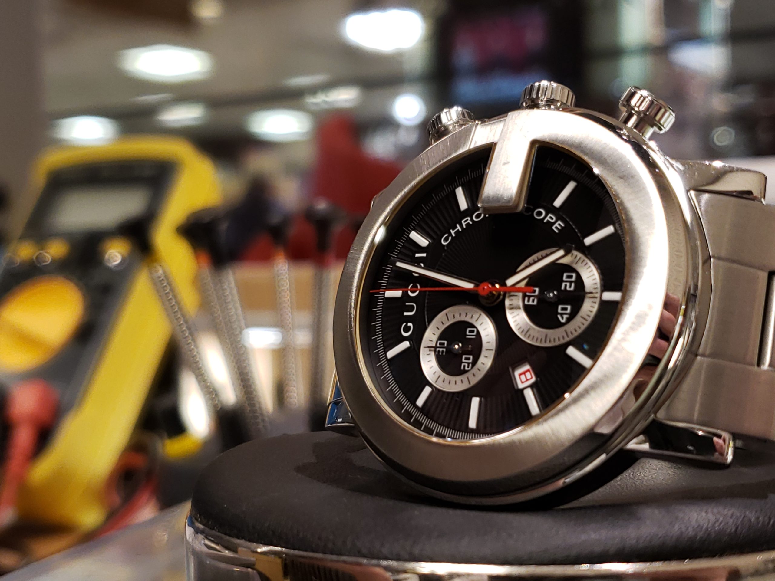 グッチ クロノグラフでございます。 電池を交換してもすぐに止まる症状でお預かり致しました。
