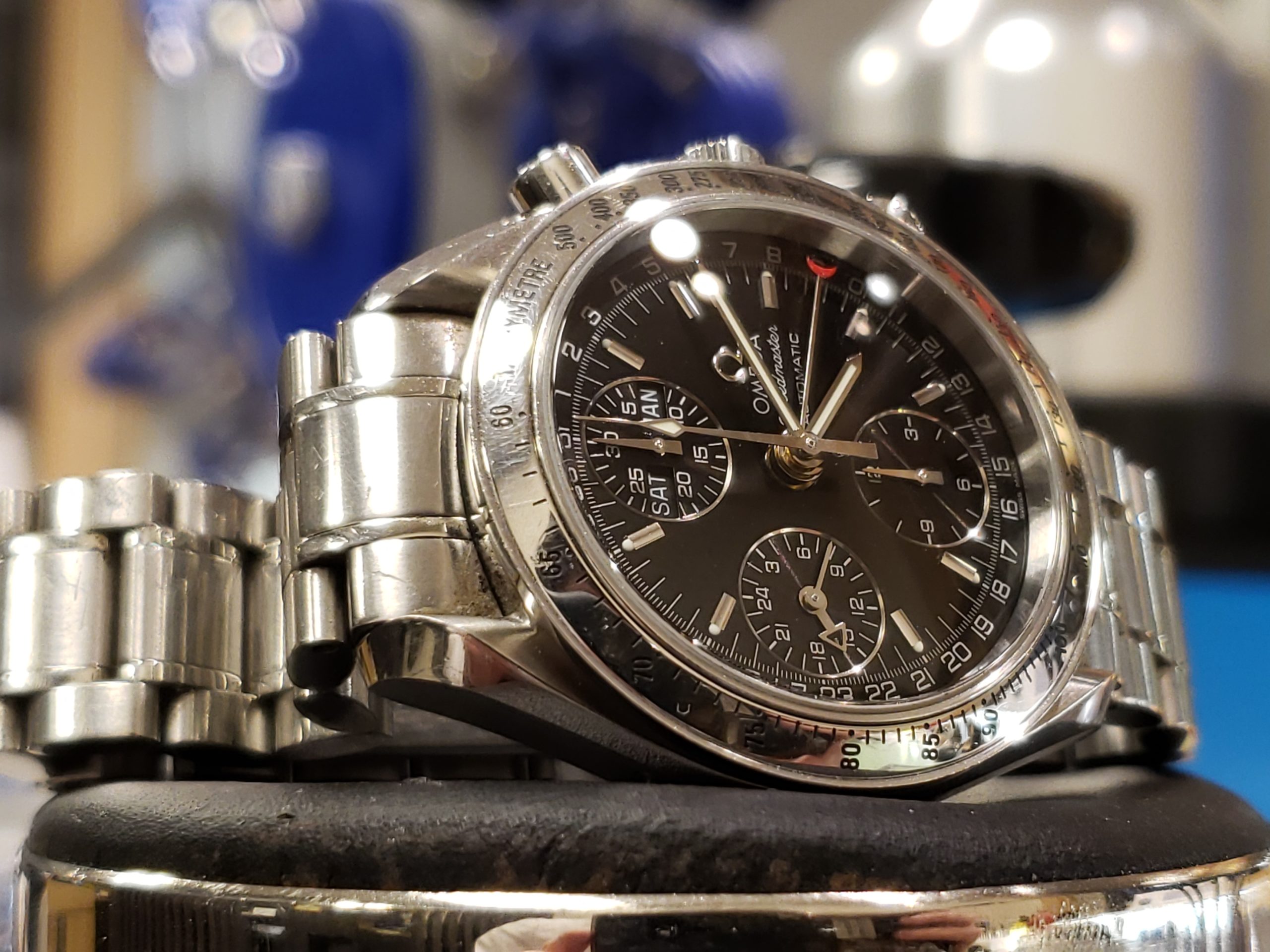 オメガ スピードマスターでございます。 時針だけ抜けてしまって、グラグラしている状態でした。