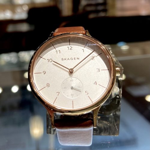 今回お預かり致しましたのはスカーゲンのお時計です。 シンプルでお洒落なデザインでどんなシーンでも着けられる、人気の高いお時計です。特にこちらのお客様のお時計はスモールセコンドがとても可愛らしく色合いも素敵ですね!
