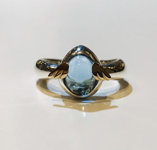アクアマリンが輝く、羽根のモチーフで可愛らしいデザインの指輪のサイズ直しを行いました。