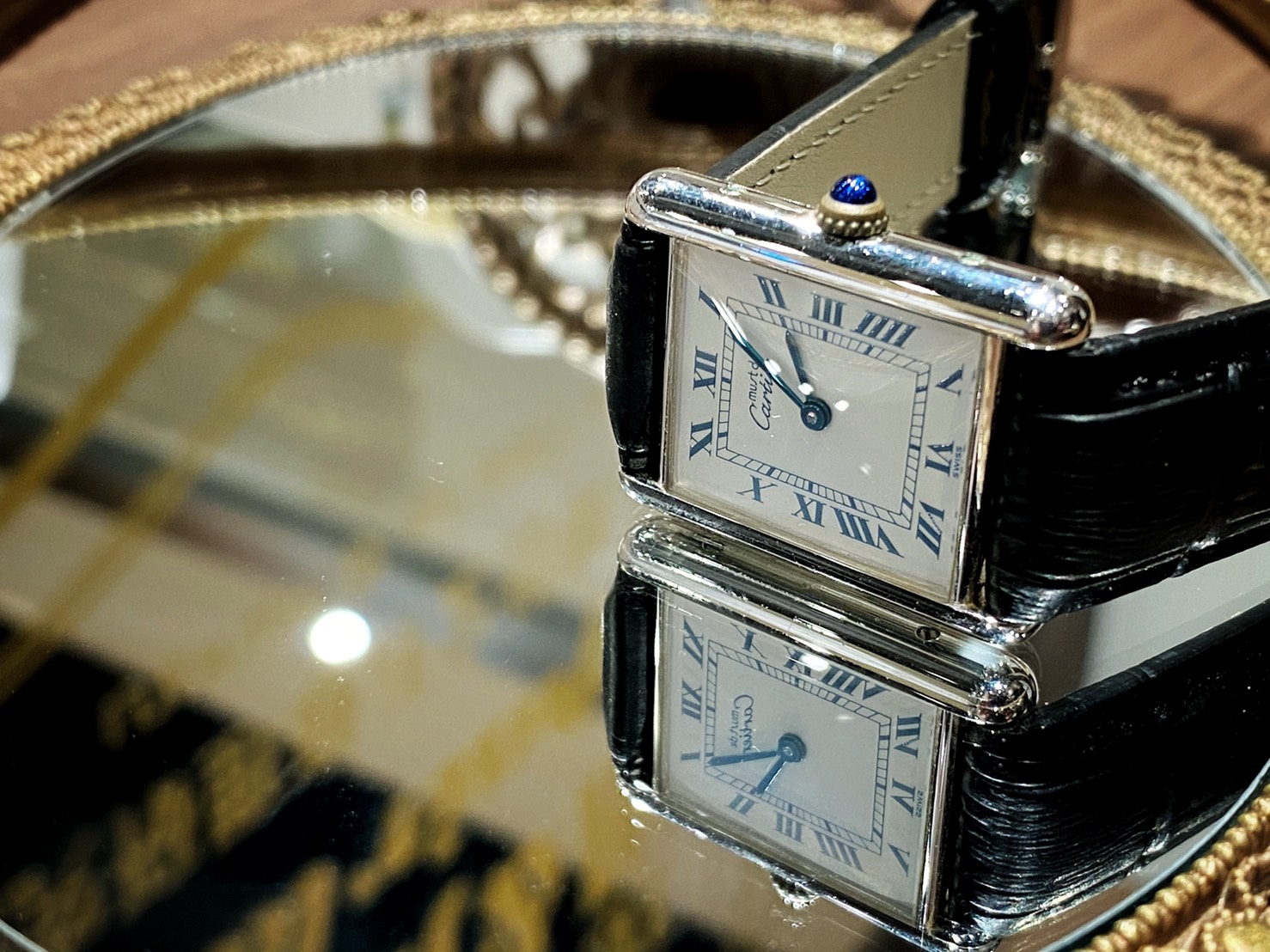 先日お預かりしましたのは、アンティークでご購入されたというカルティエのタンクです。淡いブルーのインデックスがとても美しい柔らかい雰囲気を持った逸品です。リューズのロジウムが剥げてしまっており、こちらを再メッキして欲しいとのご依頼でした。