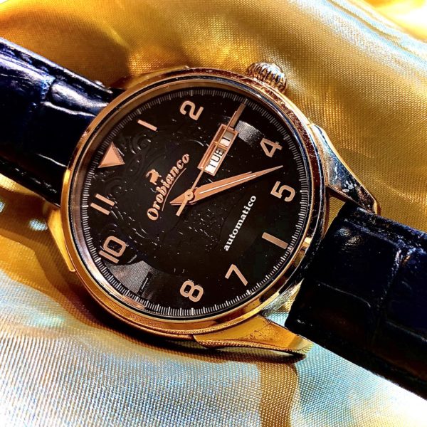 Orobiancoの機械式時計をお持ち込みいただきました。 文字盤の彫刻が素敵なデザインです。