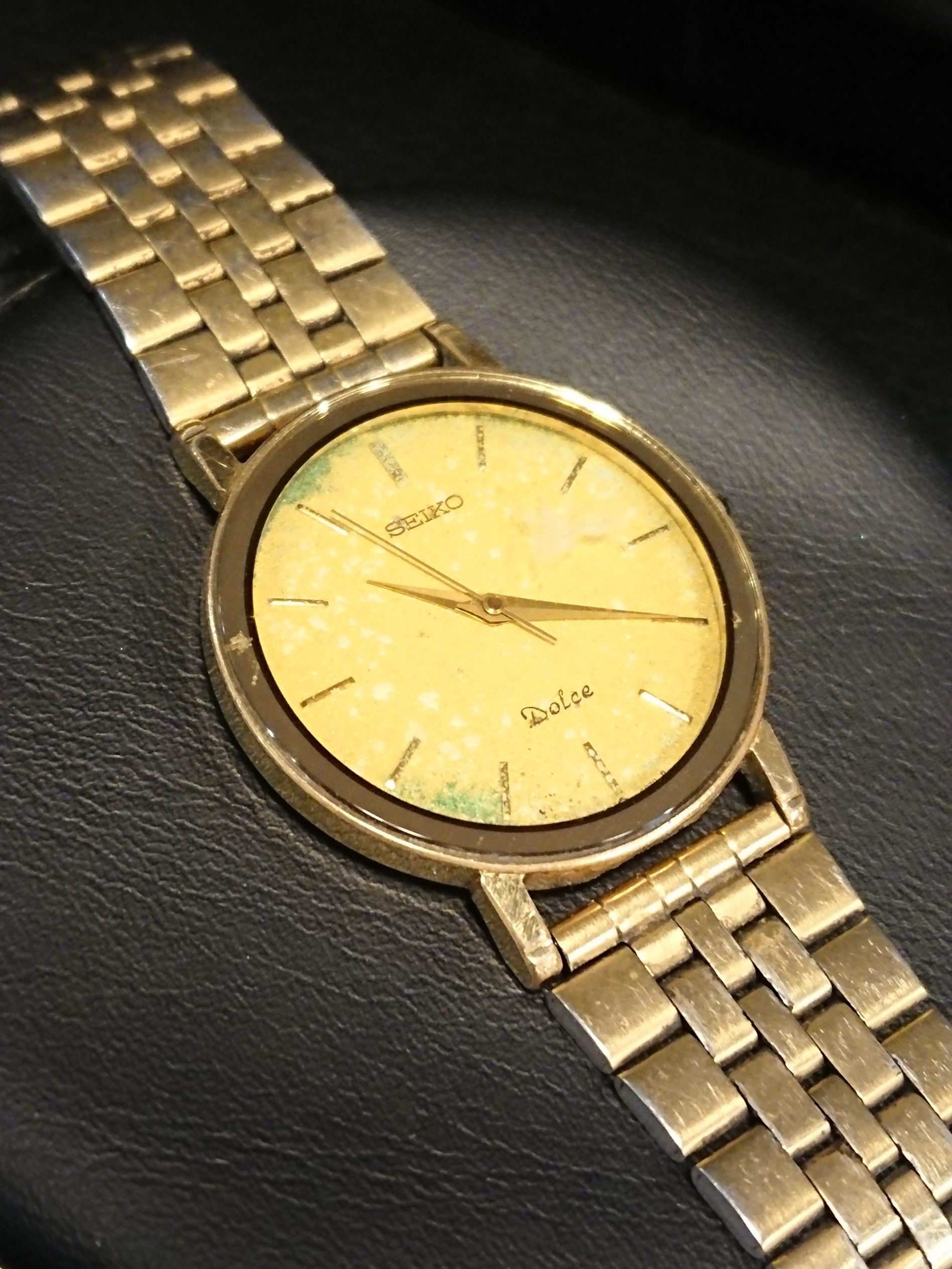 薄型でエレガントなセイコーの人気モデル。エクセリーヌと対をなす、男性用のドレスウォッチです。 もともと、強力な防水ではございませんので、永年のご愛用のうちに、湿気が随分と侵入してしまったようです。