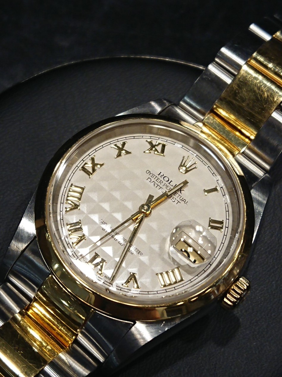 ロレックスの中でも、豊富なバリエーションがあるデイトジャスト。探せば、必ずお好みの文字板モデルが見つかるとまで言われています。こちらは、ピラミッド型に刻まれた、立体感のある文字板が何とも瀟洒ですね。