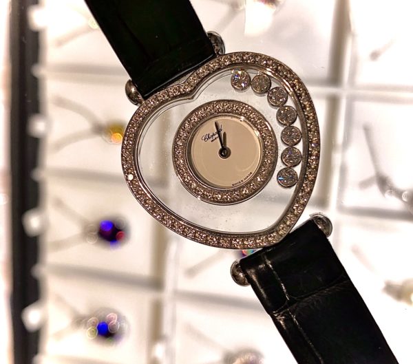 今回お預り致しました時計はショパールのハッピーダイヤモンドという時計業界で初となるデザインをされたものになります。 その中でもこのデザインは珍しくお客様も一目惚れをして購入されたそうです。