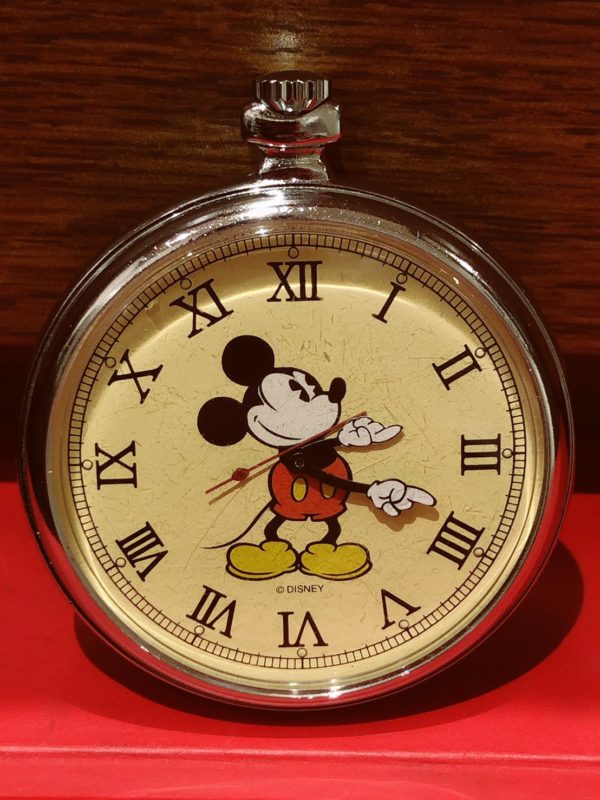 今回お預かりいたしましたお品物はお客様がディズニーランドに行かれた際に購入された思い出の時計です。 キャラクターが指で時間を教えてくれる可愛らしい懐中時計になっています。