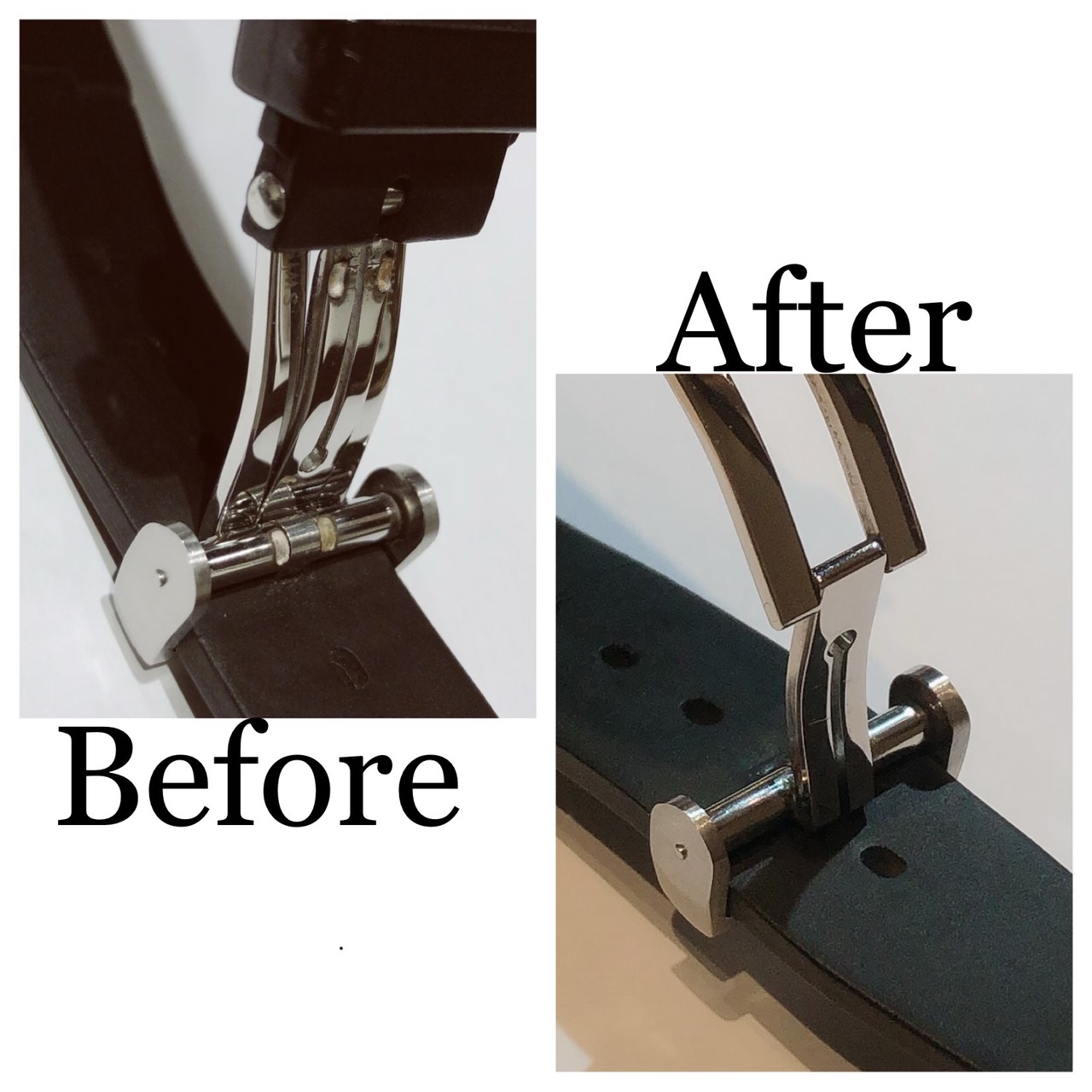 時間も見やすく重量感のある、 ブルガリのカッコイイ時計です。 ベルト・バックルの固定部品が劣化で取れてしまいつけられない状態になってしまいました。