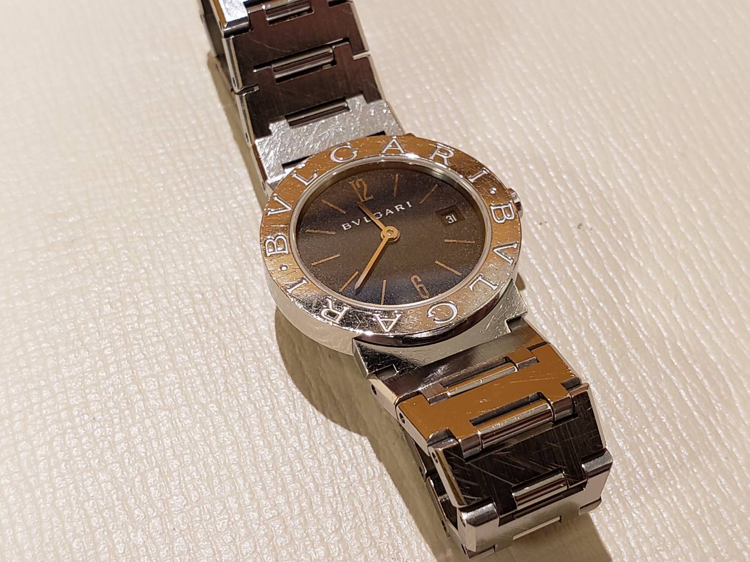 ブルガリでございます。 電池交換でお預かりしたのですが、リューズと巻真の接着が緩んでいて外れてしまっていました。 お預かりになるので、ついでにとクリーニングも承りました!