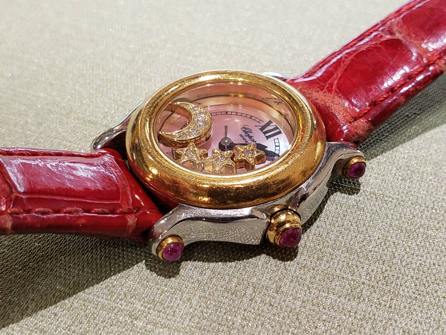 ショパールのハッピースポーツでございます。 文字盤の上をダイヤが動いて輝くという個性的でとても可愛らしいデザインです!